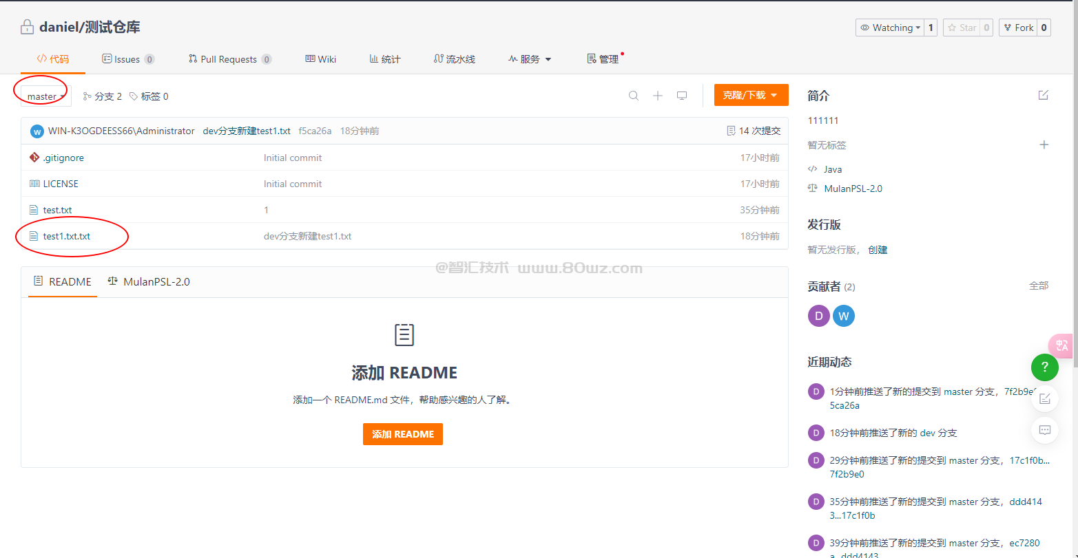我们区git服务端校验下,看test1.txt文件是否被推送到master分支了。