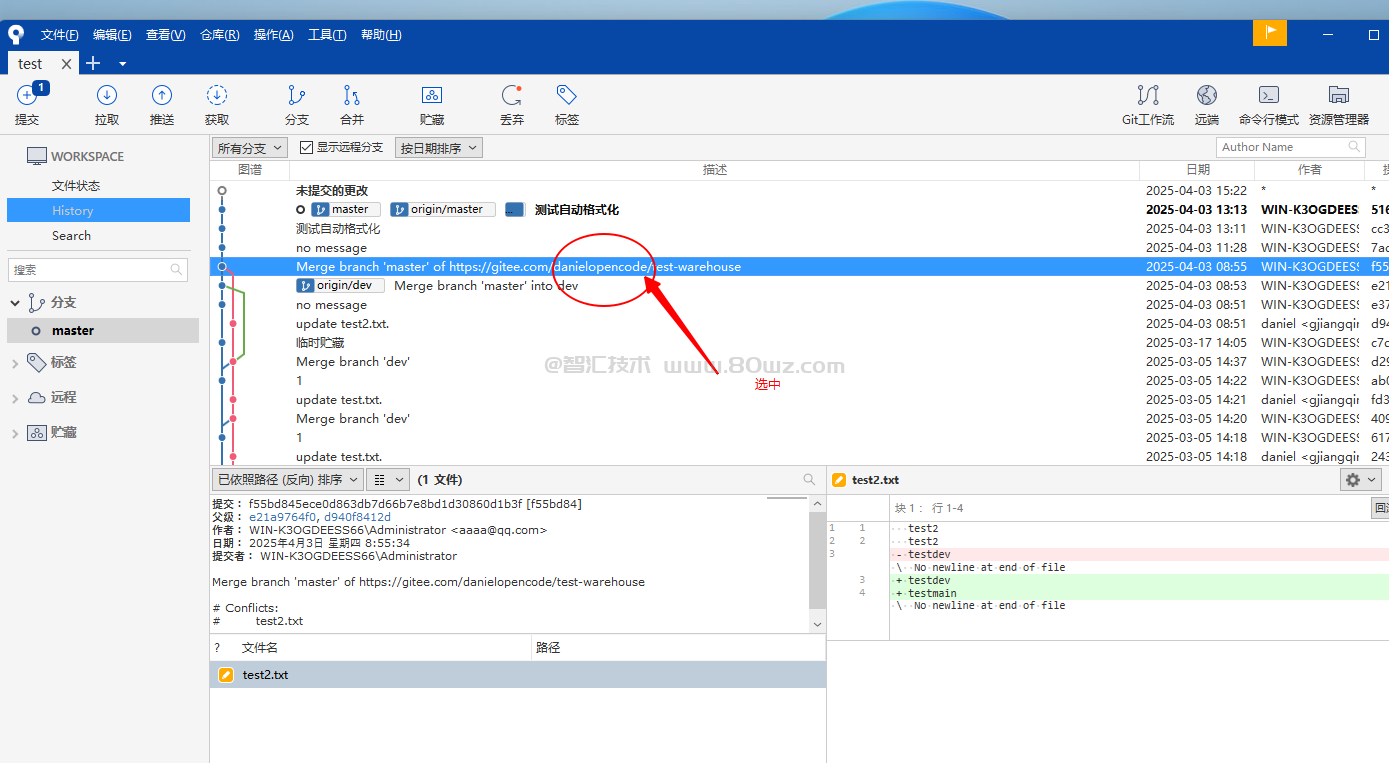 比如我们的测试代码现在是master版本,最新的提交是2025年4月3日下午13:13分,