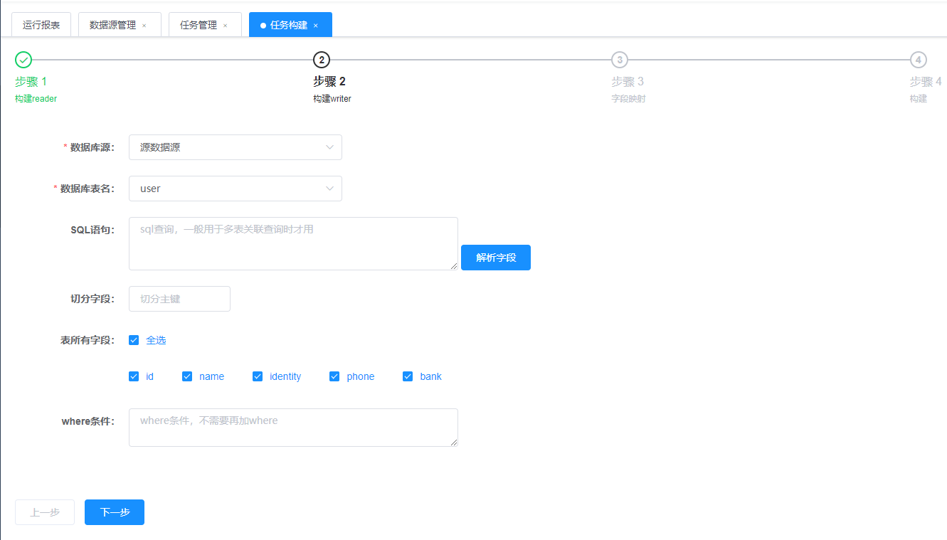 前面的操作步骤是一样的,只有两个地方需要进行修改,第一个地方是json配置。我们先来看看全量的数据迁移的json配置是什么样子的